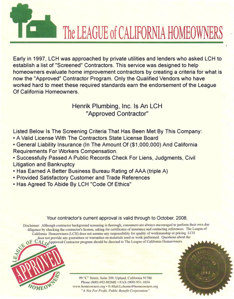 Henrik has been re-piping all types of piping and plumbing systems since 1985, we re-pipe water supply systems, sewer drainage systems, and natural gas supply. We service all of Southern California including Orange, Los Angeles, and Ventura counties. Experience MattersWe are true re-piping experts. We have re-piped over 31,000 homes, apartments, and commercial buildings. In California re-piping and re-pipe is part of the plumbing C-36 license classification. We are a licensed expert plumbing company. We do not use sub-contractors. When we re-pipe your building we will have a well trained and experienced crew working on your project. We provide the highest quality re-pipe job in the industry, and this with a double the difference price guarantee (see details). We offer the highest quality for the best price - guaranteed! What is Re-piping?Re-piping means replacing the plumbing systems (water supply, drains or gas). This replacement process is referred to as a “repipe” or "repiping”. The re-piping process can also be referred to as new piping, re-plumbing, re-plumb and piping replacement. Our SpecialtyHenrik Plumbing specializes in U.S.A. Type "L" Hard Copper repiping and PEX repiping. Our crews are experienced on how to lay out the job, order parts, install, and inspect the re-piping process. We have expert patching crews in house. Call us today and let one of our plumbing managers give you a free in home estimate, and show you how we can re-pipe your home or building the right way, and for less money - guaranteed! Plumber Comparison ChecklistTake a moment to review our PLUMBERS COMPARISON CHECKLIST and you will be confident that we are the best in the industry.